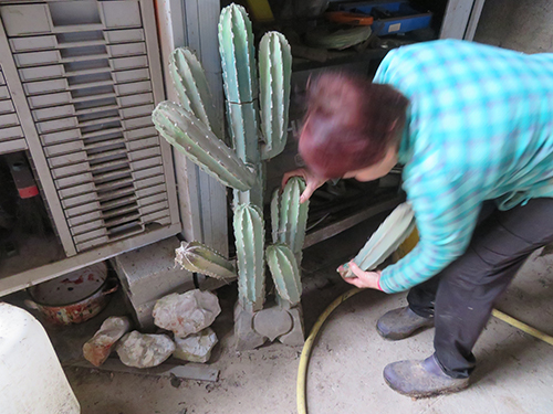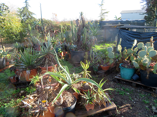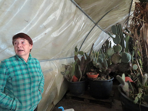 | -Mme Pinlou- Parce que la mère de mon mari aimait les cactus. En 85, y’a eu des grands froids et ils se sont gelés. Alors mon mari a commencé à en acheter quelques-uns. Et puis on a fait une petite serre, et puis une plus grande.