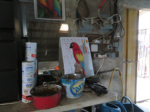| -Élie Pinlou- Y’a une dame qui vient les chercher pour faire des colliers, des boucles d’oreilles. Celui-là, c’est un croisement d’Ararauna et de Chloroptère et ça donne un Arlequin. |